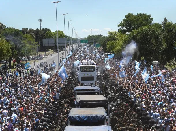 La Policía de la Ciudad de Buenos Aires informó que son al menos cuatro millones las personas que se movilizaron este martes en distintos puntos como el Obelisco porteño, la avenida 9 de Julio, la autopista 25 de Mayo y Riccheri, la Plaza de Mayo y la zona de Ezeiza, desde salieron los jugadores en esta caravana post mundialista.