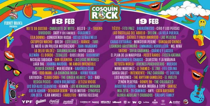 En tanto, el 19 de febrero tocarán Tiësto, Fito Páez, Babasónicos, Ciro y Los Persas, Las Pastillas del Abuelo, Dillom, La Vela Puerca, Airbag, Catriel y Paco Amoroso, Las Pelotas y Bandalos Chinos, entre otros artistas.