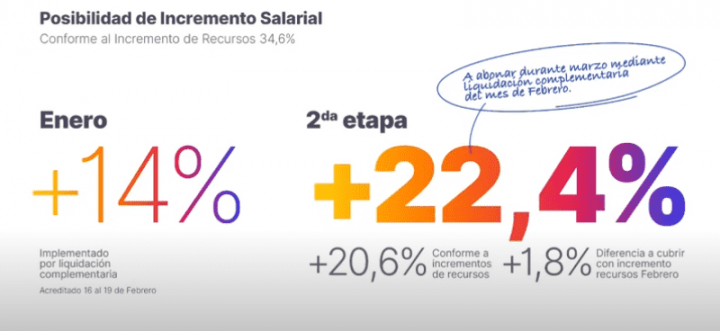 Asimismo, informó que “la recaudación de enero nos permite aumentar el 20,6% sobre lo adeudado y, haciendo un esfuerzo enorme, vamos a completar ese 1,8% faltante y vamos a saldar el 36,4% de la paritaria 2023”.