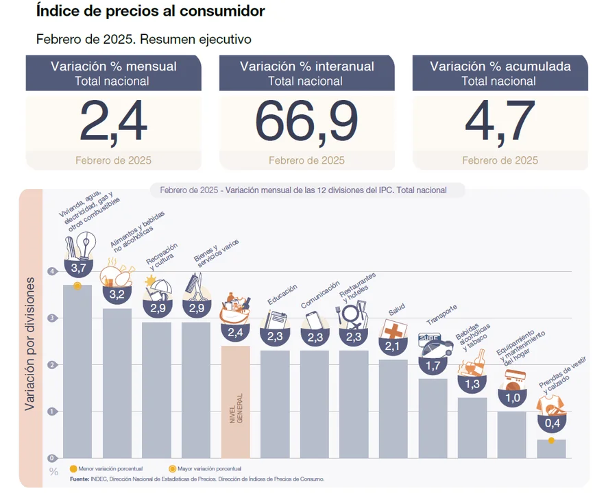 Las dos divisiones que registraron las menores variaciones en febrero de 2025 fueron Equipamiento y mantenimiento del hogar (1,0%) y Prendas de vestir y calzado (0,4%).