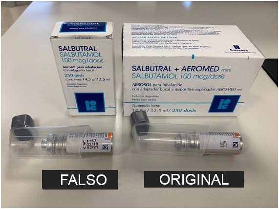 La ANMAT informa a la población que se han detectado unidades falsificadas de la especialidad medicinal "Salbutral", salbutamol 100 mcg/dosis aerosol para inhalación 250 dosis. El lote al que pertenecen las unidades ilegítimas es el 1157 F, con fecha de fabricación (F) 02/19 y vencimiento (V) 02/21.