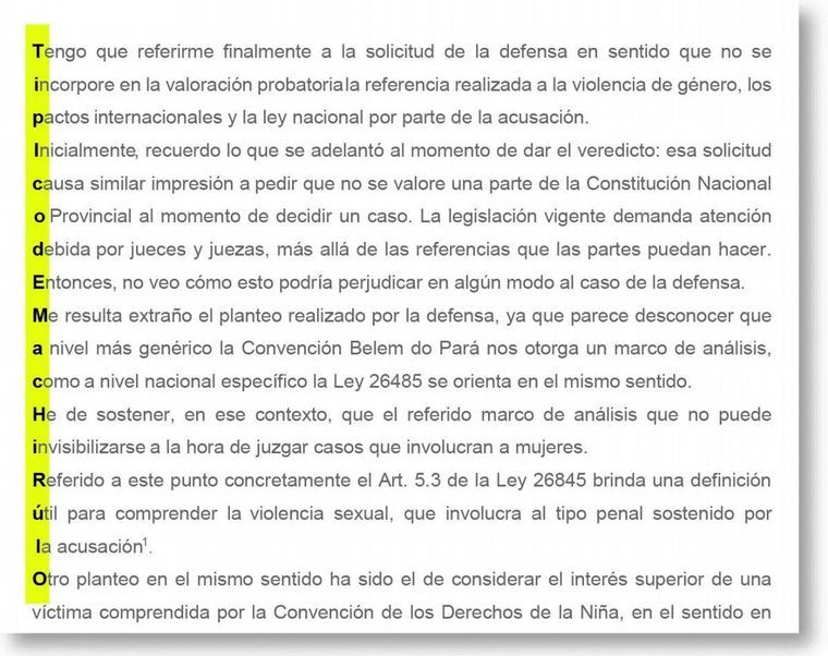 "Típico de machirulo" es la frase que se lee en vertical, cuando se unen las primeras letras de cada una de las oraciones redactadas en la página 41 (formando así el acróstico de referencia) de la sentencia del 14 de agosto destinada al defensor oficial Pablo Méndez, cuyo alegato la magistrada criticó por falta de perspectiva de género.