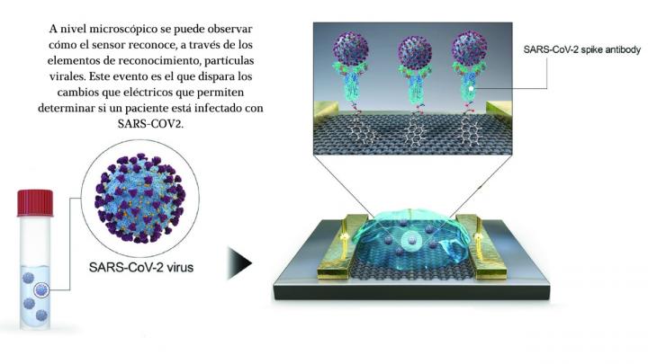 A nivel microscópico puede observarse cómo el sensor reconoce, a través de los elementos de reconocimiento, partículas virales. Este evento es el que dispara los cambios eléctricos que permiten determinar si un paciente está infectado con SARS-COV-2.