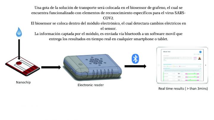 Una gota de esta solución se pone en el biosensor de grafeno, el cual se encuentra funcionalizado con elementos de reconocimiento específicos para el virus SARS-COV-2. El biosensor se coloca dentro del módulo electrónico, que detecta cambios eléctricos en el sensor.