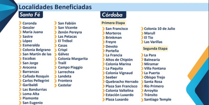 Los municipios y comunas santafesinas que se verán beneficiadas con el acueducto serán: Coronda, Gessler, María Juana, Sastre, López, Esmeralda, Colonia Belgrano, San Martín de las Escobas, San Jorge, Arocena, Barrancas, Cañada Rosquín, Carlos Pellegrini, Garibaldi, Las Bandurrias, Loma Alta, Piamonte, San Eugenio, San Vicente, San Fabián, Zenón Pereyra, Las Petacas, El Trébol, Casas, Crispi, Gálvez, Colonia Margarita, Traill, Campo Piaggio, Larrechea, Landeta, Frontera y Castelar.
