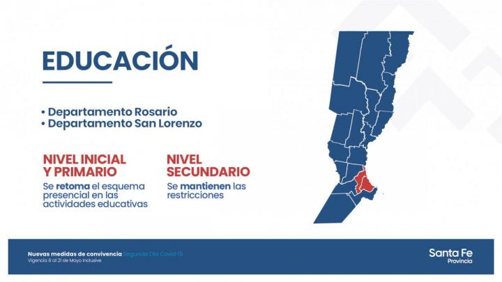 El titular del Ejecutivo provincial indicó que “a partir del próximo lunes, vamos a retomar las actividades educativas en los niveles primario e inicial en los departamentos Rosario y San Lorenzo. Pero se mantendrá por una semana más, la suspensión en el nivel secundario en ambos departamentos”.