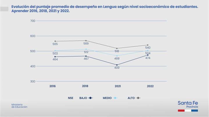 En tanto que se observan mejoras en los desempeños de lengua y de matemáticas en los estudiantes de nivel socioeconómico bajo y medio, siendo esta evolución considerable en relación a los años 2021 y 2018.