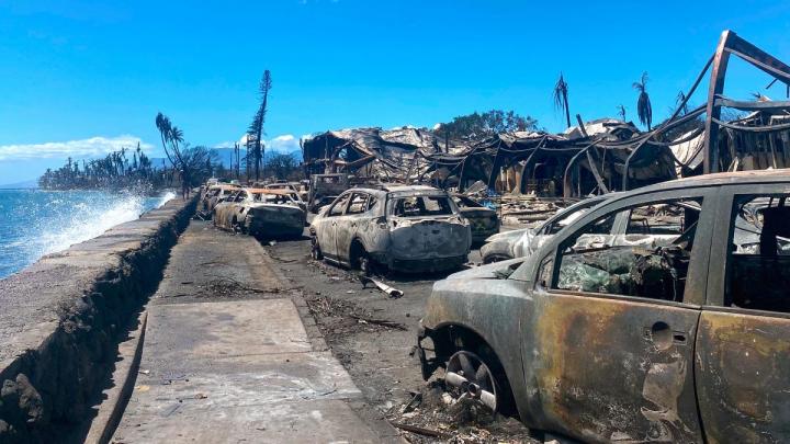 Según periodistas de The Associated Press (AP), el corazón de Maui está devastado y los típicos gallos que se pasean por el área, circulan entre las cenizas y las decenas de vehículos que no pudieron escapar del fuego.