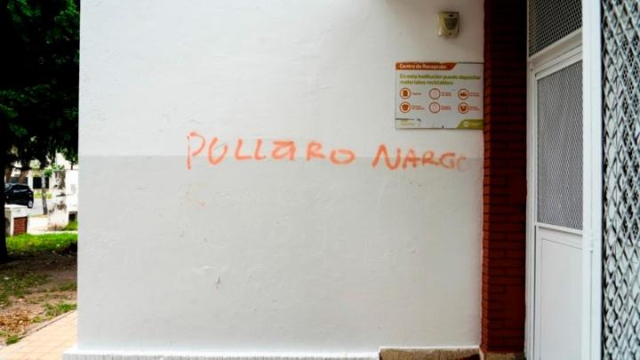 Personas no identificadas escribieron exactamente lo mismo con el aerosol, aunque no pudieron completar la frase y el resto lo rajaron con una piedra u otro elemento.