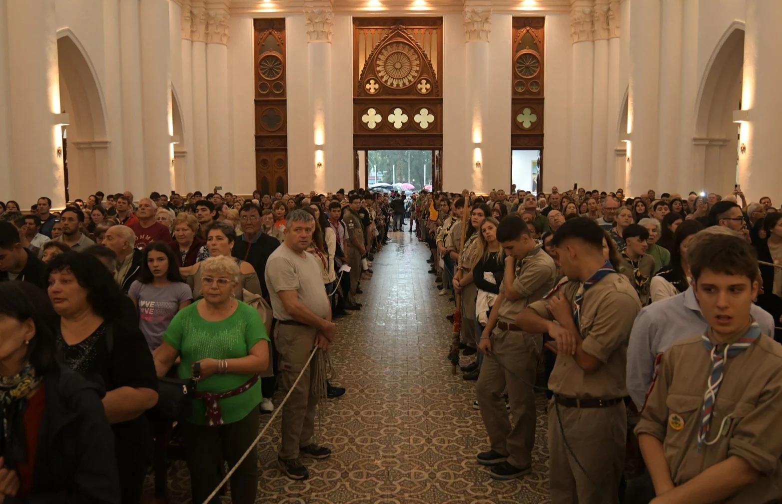 Los chicos de las juventudes religiosas trataban de acomodar con sogas y como podían esa masa humana de fe, que se iba acercando -por la vereda de calle Javier de la Rosa- lentamente hasta el templo.