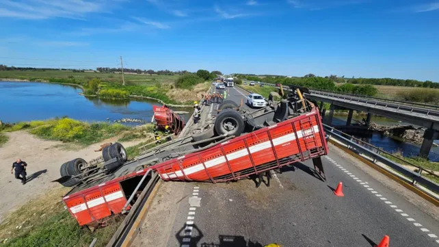El siniestro vial ocurrió este viernes por la tarde en la mano que va hacia Buenos Aires. El camión rompió la contención y quedó colgando del puente ubicado sobre el río Arrecifes.
