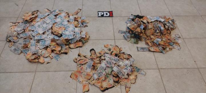 Al realizar la requisa, los agentes secuestraron dinero en efectivo en buen estado, dinero mojado y quemado dentro de una conservadora, y un teléfono móvil marca iPhone nuevo en su caja.