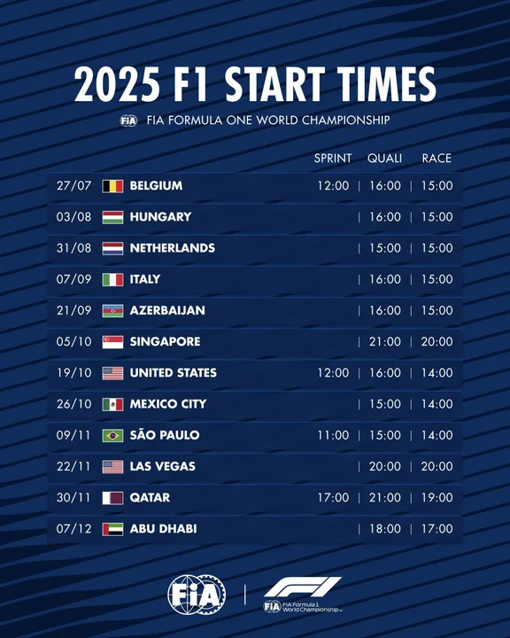 Otras carreras, como Australia, China, Mónaco y España, mantendrán un horario unificado de inicio a las 15:00 horas locales, mientras que Japón, Canadá, Estados Unidos, México y Brasil arrancarán a las 14:00 horas del país en el que se dispute.