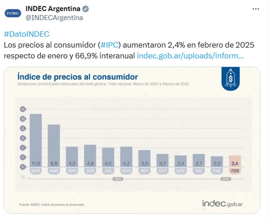 El costo de vida fue del 2,4% en febrero, por encima del 2,2% de enero, y en doce meses acumularon un alza del 66,9%.