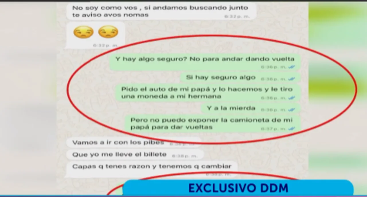 “Si hay algo seguro, pido el auto de mi papá, lo hacemos, le tiro una moneda a mi hermana y a la mi*rda, pero no puedo exponer la camioneta de mi papá para dar vueltas”, continúa la captura del chat. Dentro de la circunstancia, podría significar una marcada alusión a salir a robar.