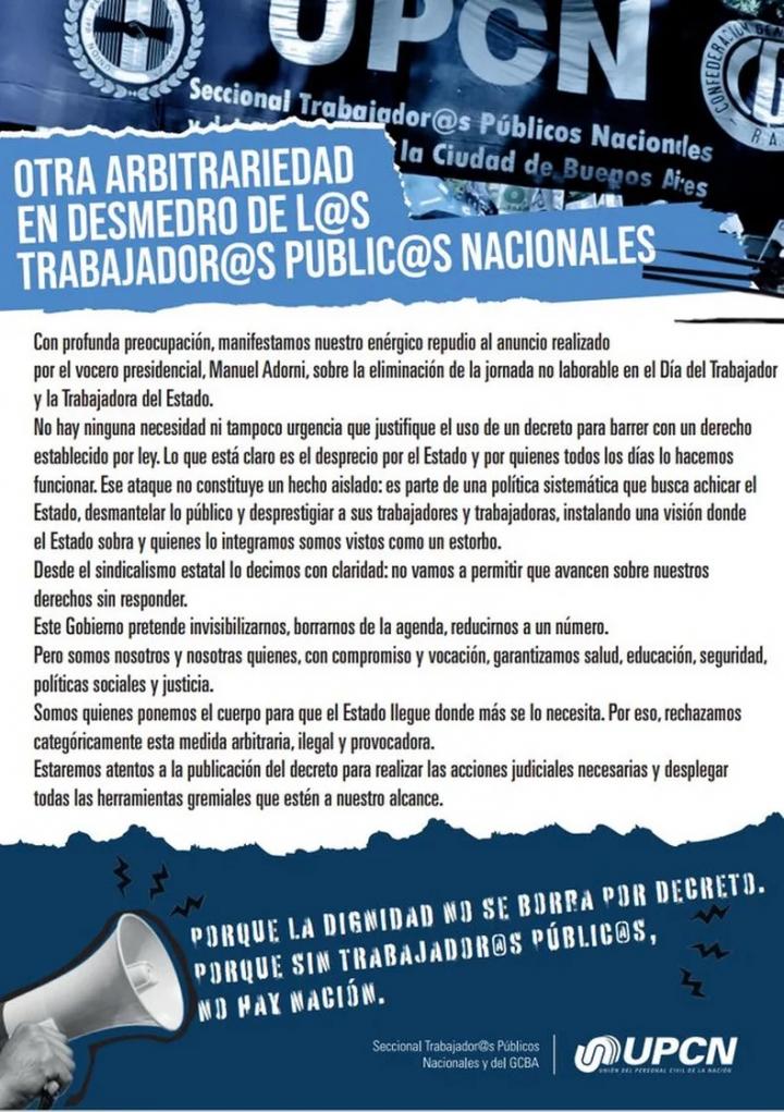 “Con profunda preocupación, manifestamos nuestro enérgico repudio al anuncio realizado por el vocero presidencial, Manuel Adorni, sobre la eliminación de la jornada no laborable en el Día del Trabajador y la Trabajadora del Estado”, expresaron en el texto.
