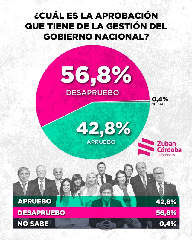 Según el último estudio nacional de la consultora Zuban Córdoba, el 56,8% de los encuestados desaprueba la gestión del gobierno de Javier Milei, mientras que el 42,8% la aprueba.