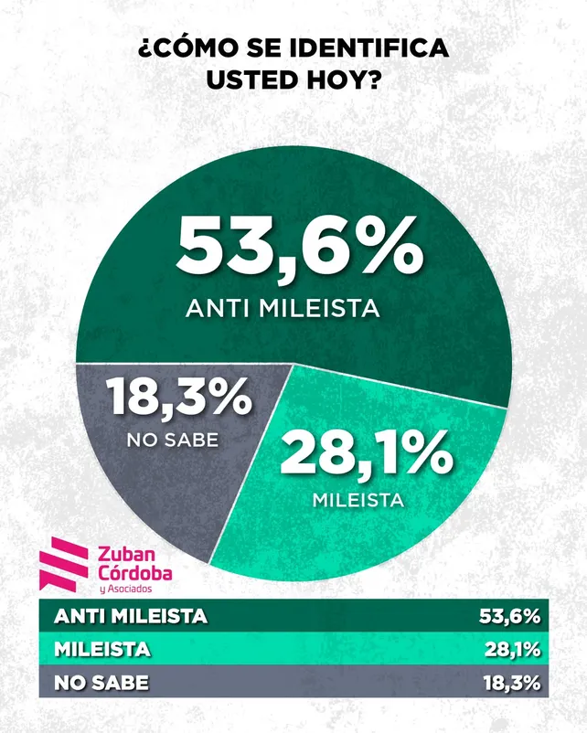 La polarización se acentúa con el crecimiento del “antimileísmo” como identidad política, que ya alcanza al 53,6% de los consultados, frente a un 28,1% que se identifica como mileísta.