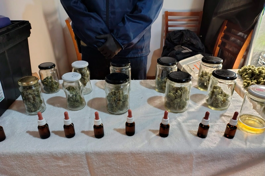 Durante los procedimientos, se incautaron 65 frascos de vidrio que contenían cogollos de marihuana, dos plantas de Cannabis Sativa, un frasco con hachís (resina de marihuana), 240 mililitros de aceite de cannabis, además de productos químicos para cultivo y fertilización, artefactos lumínicos y otros elementos que conformaban un sistema de cultivo indoor completo.