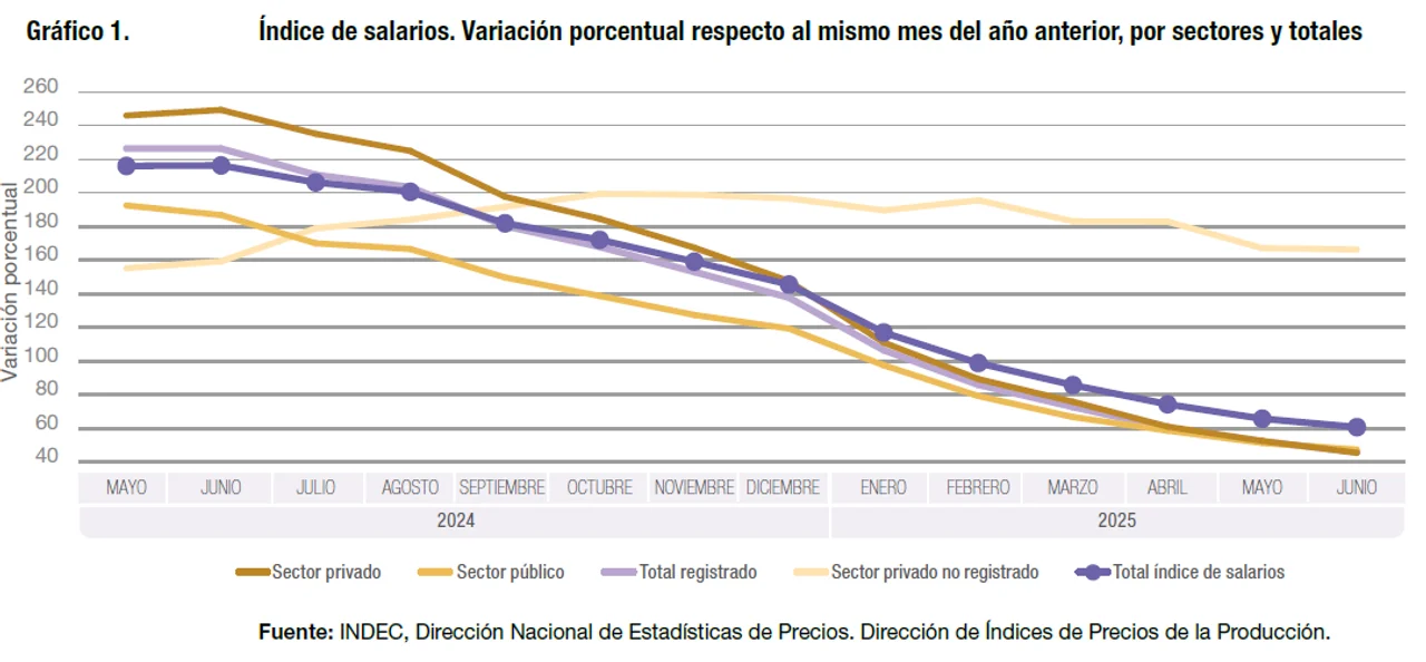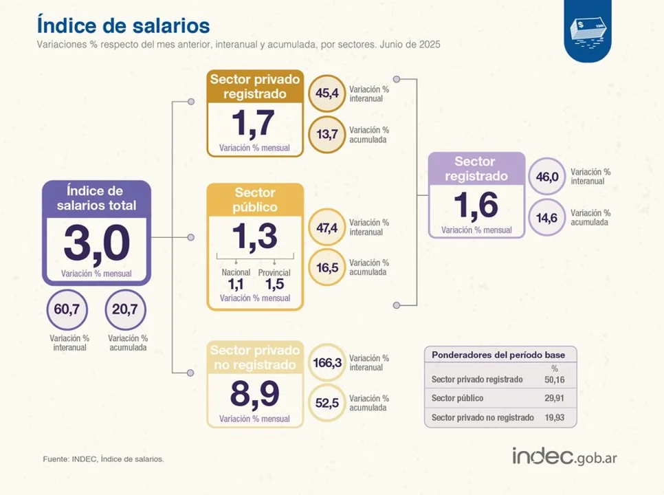 Con respecto a diciembre del 2024, el indicador de los salarios acumula una suba de 20,7%, debido a aumentos de 52,5% en el sector privado no registrado, 16,5% en el sector público y 13,7% en el sector privado registrado.