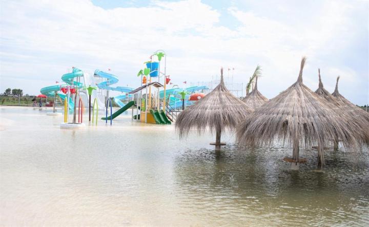 El complejo cuenta con una piscina playa de 1500 m², complementada por toboganes que garantizan la diversión acuática.