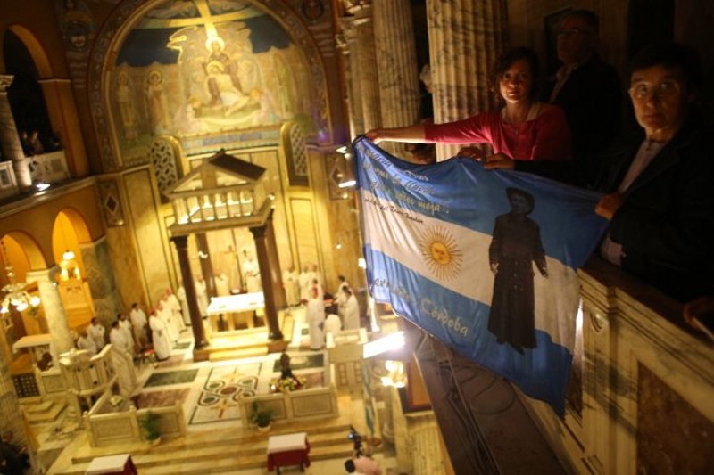 Una multitud llegada desde Argentina ocupó la parte central de la plaza con banderas y estampitas con la imagen del cura "que se puso la Patria al hombro", como lo describió a Télam el obispo de Cruz del Eje, Santiago Olivera, antes de iniciar la vigilia por la canonización, el sábado a la noche.