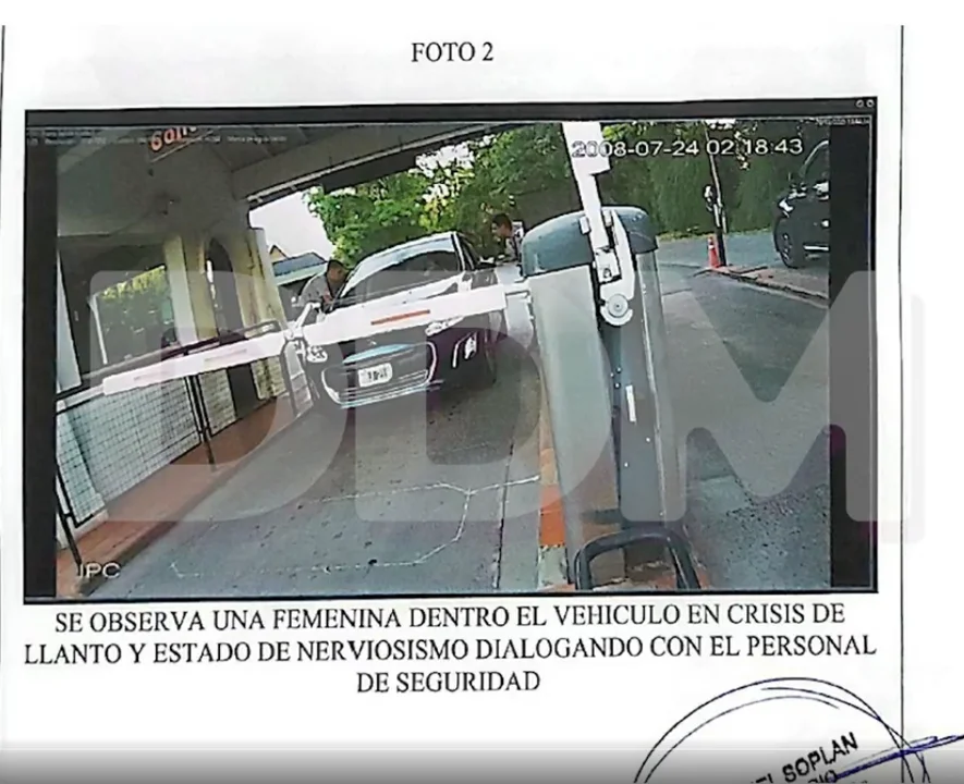 En la primera imagen “se observa al vehículo color azul, que arribó al puesto de la guardia del Country Tortugas” y en una segunda captura “una femenina dentro del auto, en crisis de llanto y estado de nerviosismo, mientras dialoga con el personal de seguridad”.