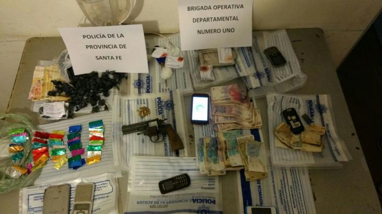 El procedimiento fue en una vivienda ubicada en Pasaje Bosso, entre Amenábar y Entre Ríos. Allí incautaron 91 bochitas de marihuana, 69 envoltorios de cocaína, un revolver calibre 22 largo con proyectiles, además de una balanza, una licuadora, celulares y 4.500 pesos en efectivo.